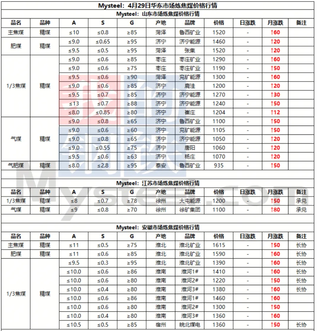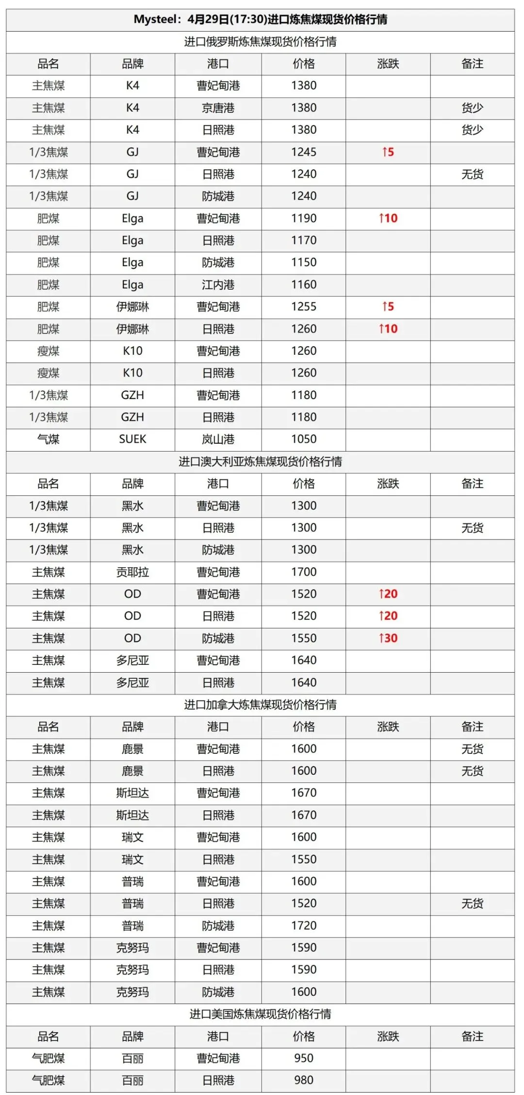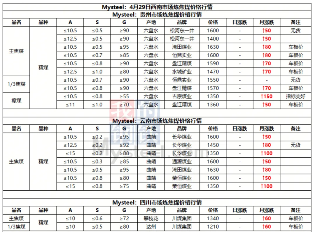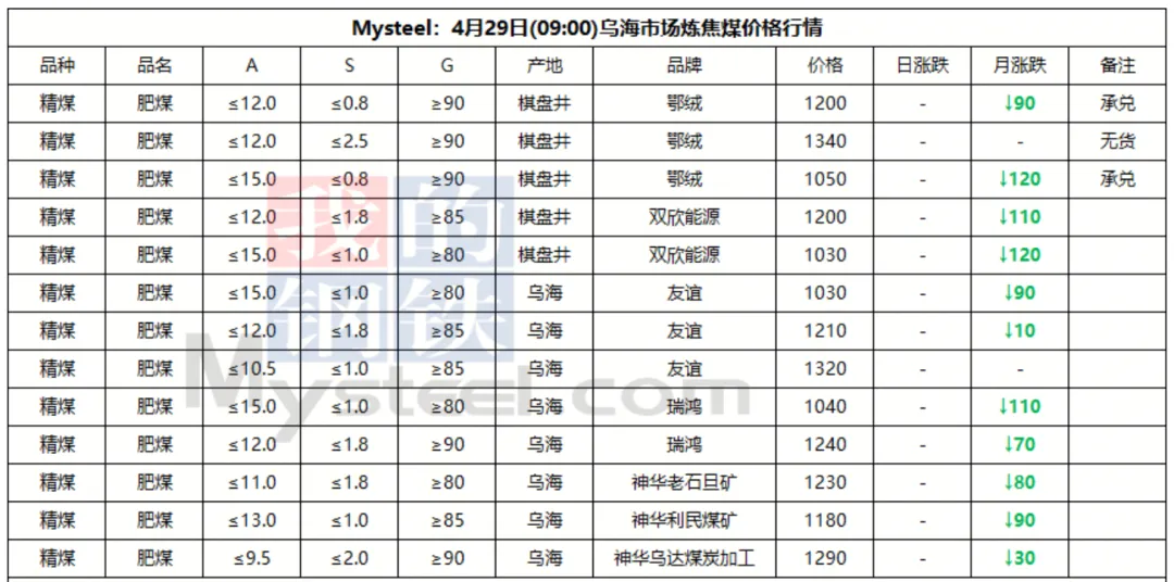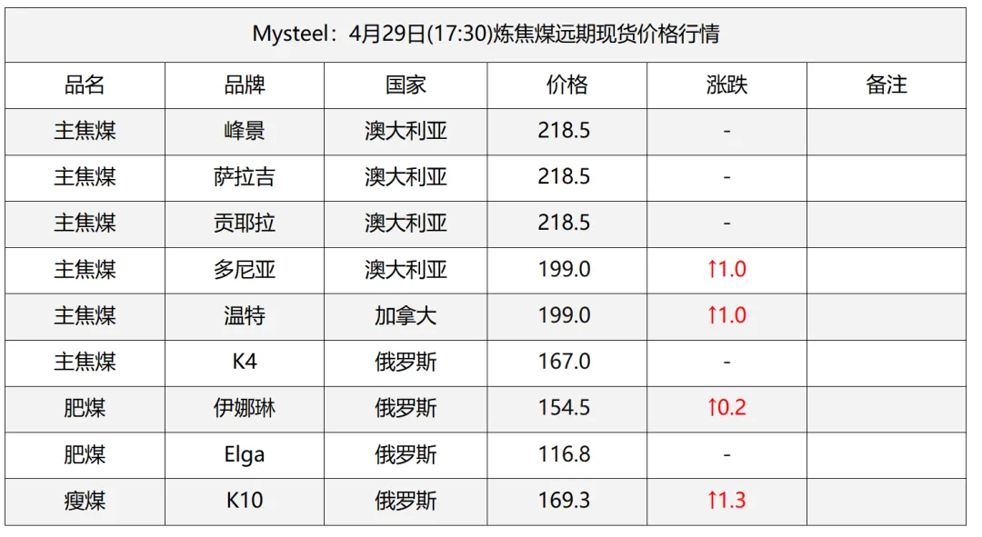 29日吕梁市场炼焦煤震荡运行,线上竞拍成交涨跌互现,市场观望心态浓厚。产地端个别煤矿因月度任务完成停产,多数煤矿正常生产,煤矿新签订单以焦钢终端企业为主,贸易企业采购量较小,煤矿库存处于中低位,线上竞拍成交涨跌互现。中间洗煤及贸易企业采销情绪一般,观望心态浓厚。考虑到五一小长假,下游焦企仍有补库需求,焦炭第三轮提涨后暂未落地。短期内炼焦煤价格窄幅震荡运行,价格上涨难度较大。