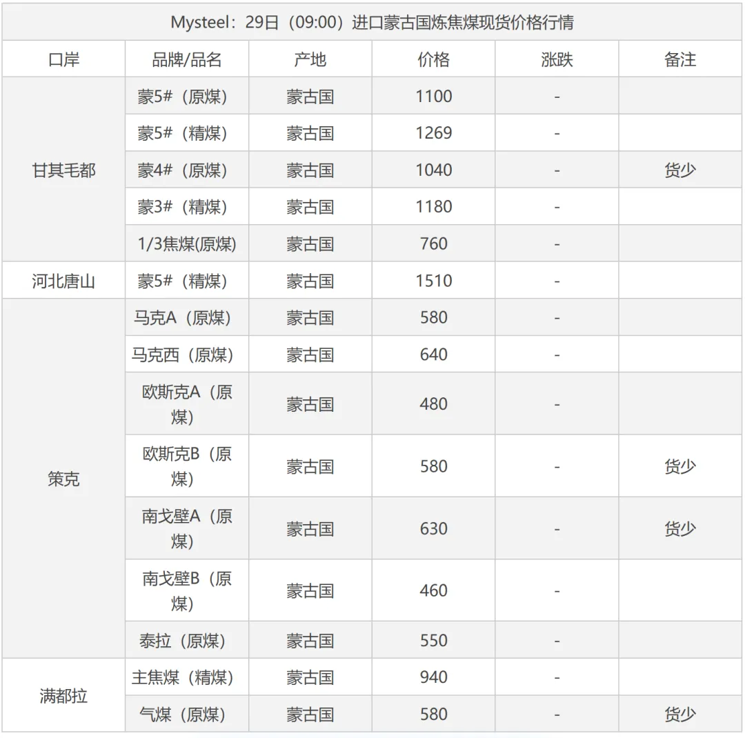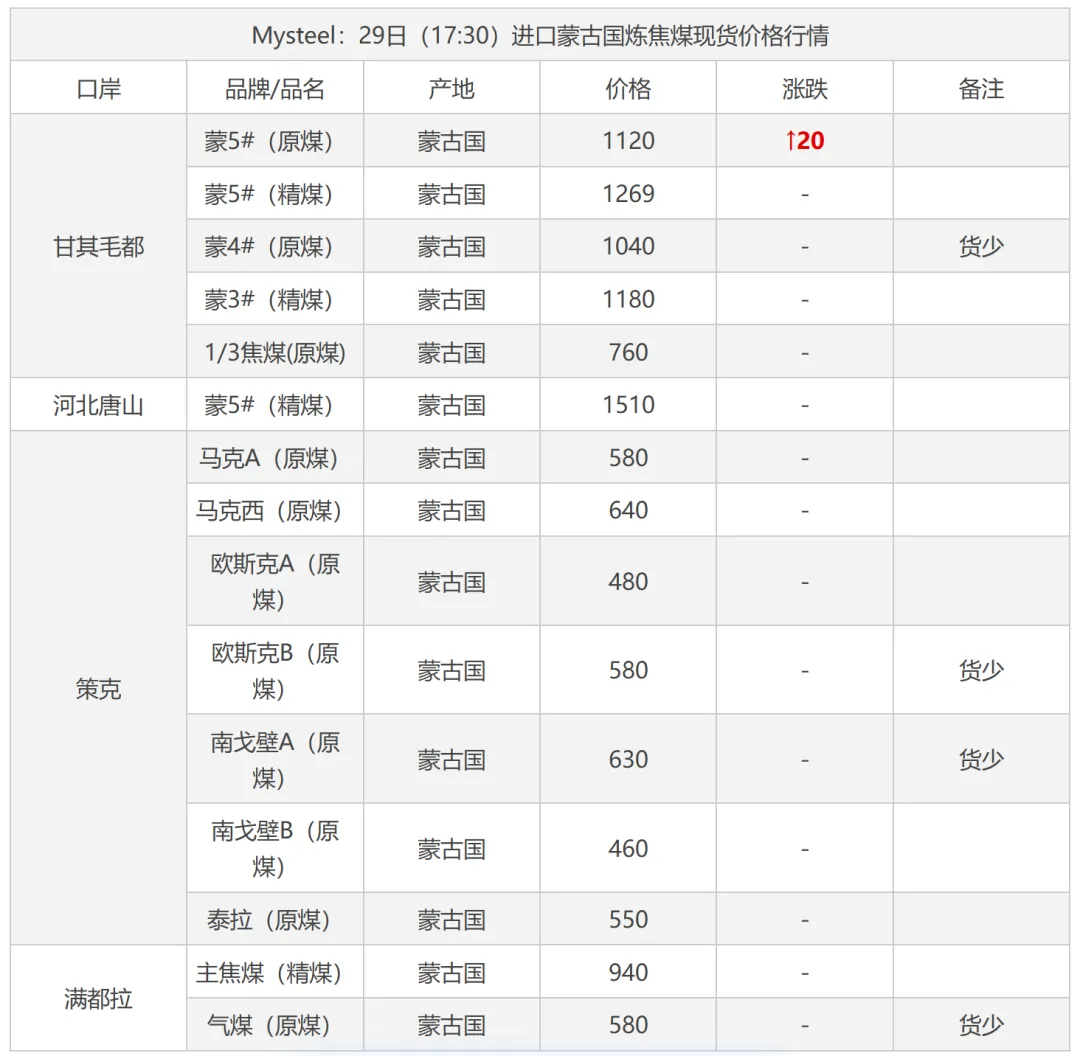 29日太原市场炼焦煤价格暂稳。本周炼焦煤市场延续窄幅震荡行情,竞拍市场涨跌互现,上下波动不大,成交氛围良好,线上竞拍成交率居高不下。总体来看,炼焦煤市场情绪依旧乐观,焦炭提涨以及成材需求向好提振市场信心,动力煤价格上涨也为市场注入活力,预计短期煤价仍旧将以高位震荡运行为主。现古交低硫主焦煤出厂含税价1526元/吨;清徐瘦煤出厂含税价1280元/吨。