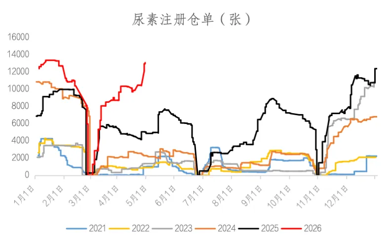 2026年4月29日,尿素仓单数量13075张,环比上个交易日+150张。