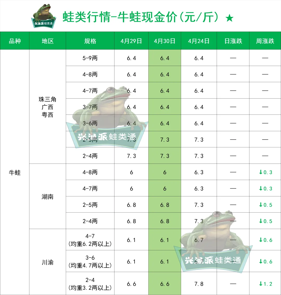 >4月30日全国牛蛙、黑斑蛙、泰蛙最新行情