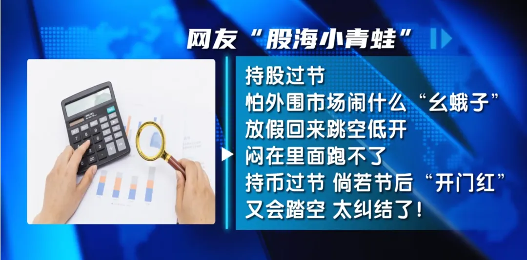 “股海小青蛙”说:持股过节,怕外围市场闹什么“幺蛾子”,放假回来跳空低开闷在里面跑不了;持币过节,倘若节后“开门红”,又会踏空。太纠结了!