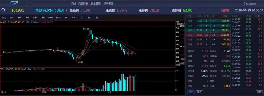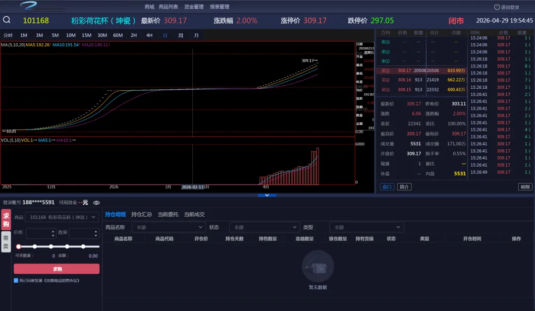 景瓷交易所,我们所跟踪的四只品种,今天全部收红,除了鸿茗仍旧处于调整周期中,其余三支都是稳稳的上涨,和暴拉暴跌的行情比较起来,景瓷交易所的这种上涨模式更显温润,一天中行情波动不大,但坚持下来,利润同样可观。这是景瓷交易所一直以来的特点,涨幅不大,但是持续时间长,踩对趋势,跟着吃点肉还是问题不大的。像这些票,从月初开始跟踪,已经一个月了,下个月,行情还要持续。绿盛缘101353复盘后连续涨停,今天是第四个交易日,处于一个上涨趋势的新票,其价格已经不能简单猜测,其价格必然跟市场有关,只是从当前缩量上涨来说,近期基本上还会延续这种上涨态势。下方千万级买单。坤瓷101168已经连续三个交易日涨停板成交超百万,今天的成交继续小幅扩大,达到171万,下方买单接近2000万,是目前整个景瓷资金规模最雄厚的品种。鸿茗101931的走势是另一种稳定,其稳定在于不变的调整趋势,而且其价格波动小,价格围绕在70附近小幅震荡。今天上市了一只新票,鲲鹏101368,首日涨幅百分之30,后续可关注何时开板。由于交易所软件的特殊性,必须在下面号段开户的会员才可交易以上品种。景瓷开户链接如下https://yw.ceramic-copyright.com/mobile/#/register/10135007APP下载链接安卓(请复制链接至浏览器打开):https://downloadgp.ceramic-copyright.com/download/index.html