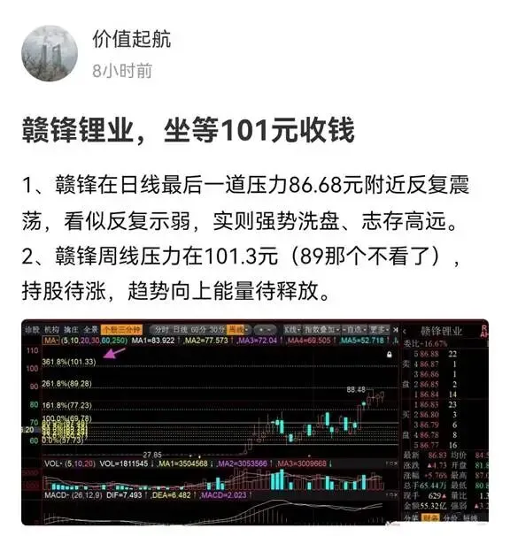 纯锂矿公司没有具体研究过,周期性太强,但赣锋锂业作为锂矿+锂电+储能全产业链龙头公司,一直在跟踪和持有。赣锋锂业最近在86.68元日线压力附近强势震荡,突破后将切换为周线级别上涨,小目标先看101.3元,刚才看到赣锋公告一季报净利润18.37亿,这个数字超过其2025年全年净利润了(16.13亿)。