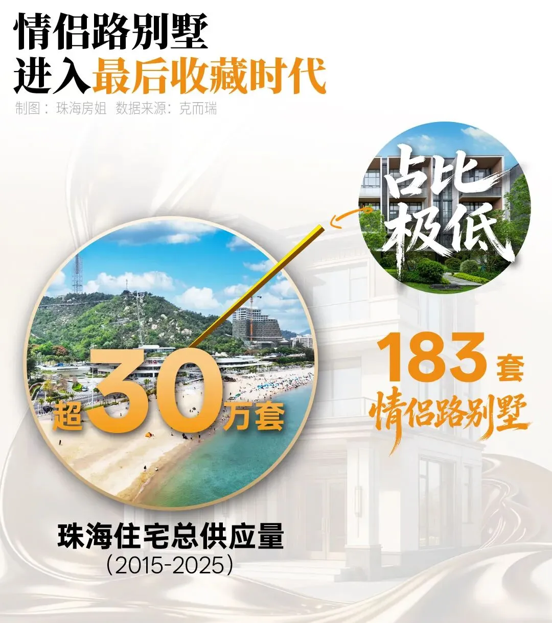这种纯墅形态,天然形成了圈层的 “筛选机制”,让居住本身成为一种身份标签的彰显。而这份圈层的纯粹性,更因产品的稀缺而愈发珍贵。克而瑞数据显示,近10年间(2015-2025),珠海住宅供应超30万套,但情侣路别墅仅183套,占比极低。