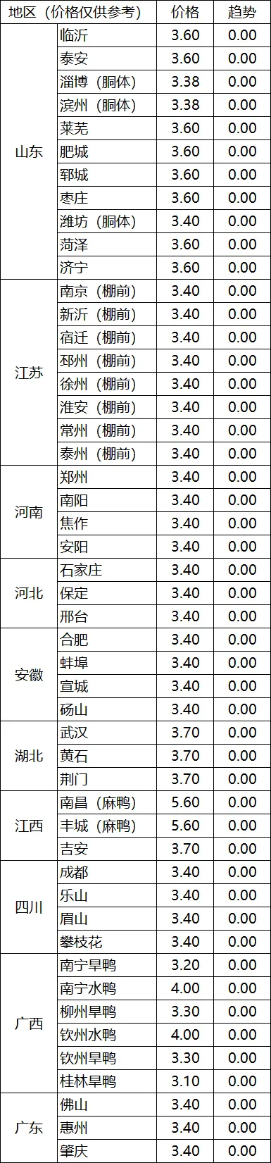 烟台地区肉毛鸡棚前收购价3.65-3.75元/斤,与29日相比持平;
