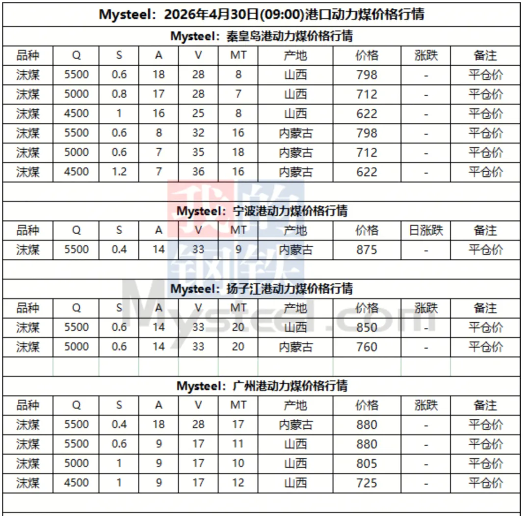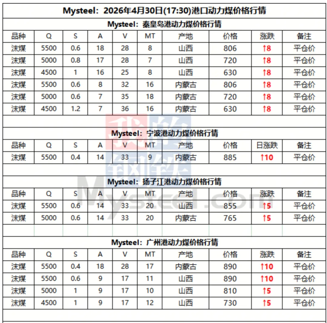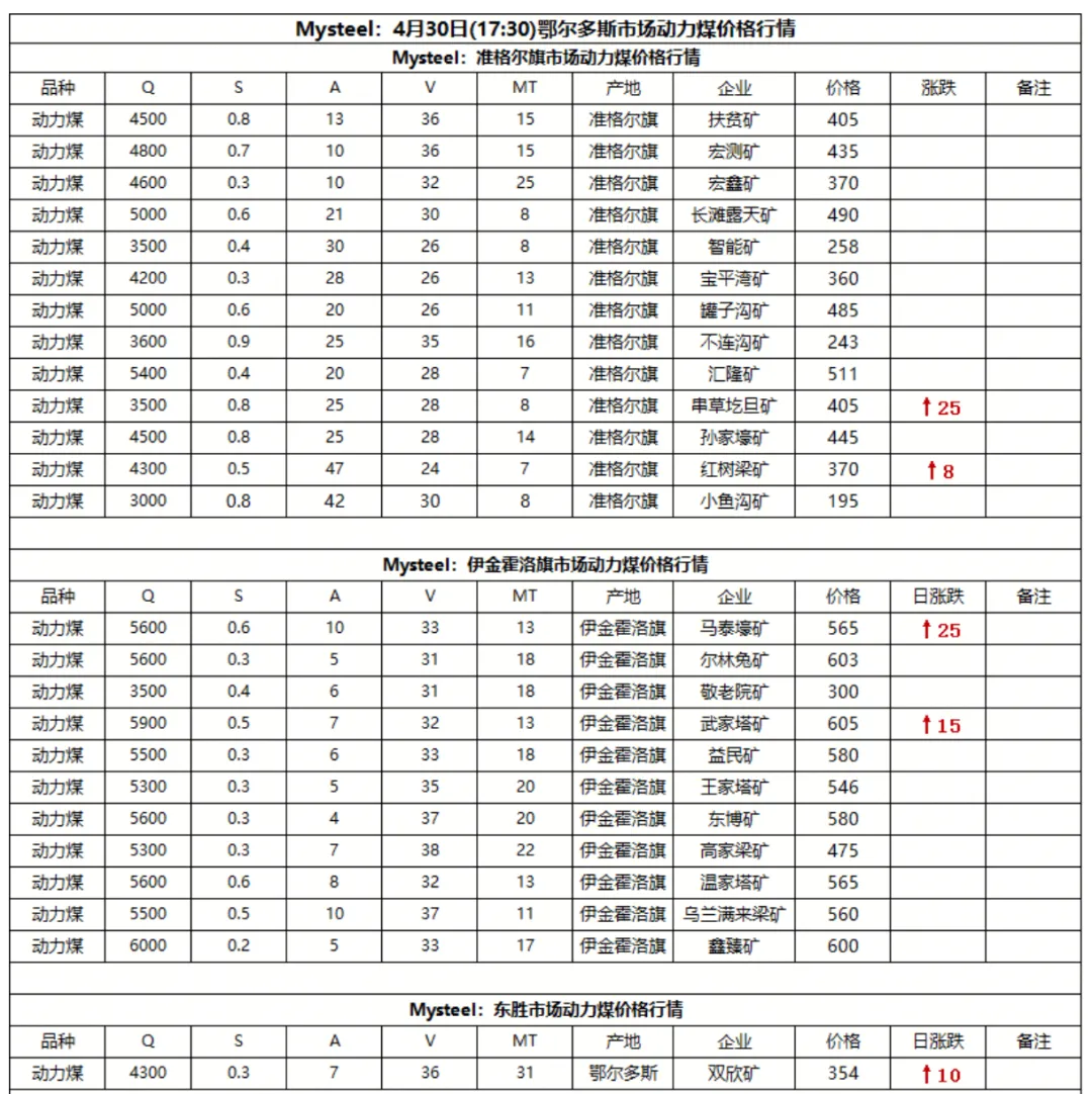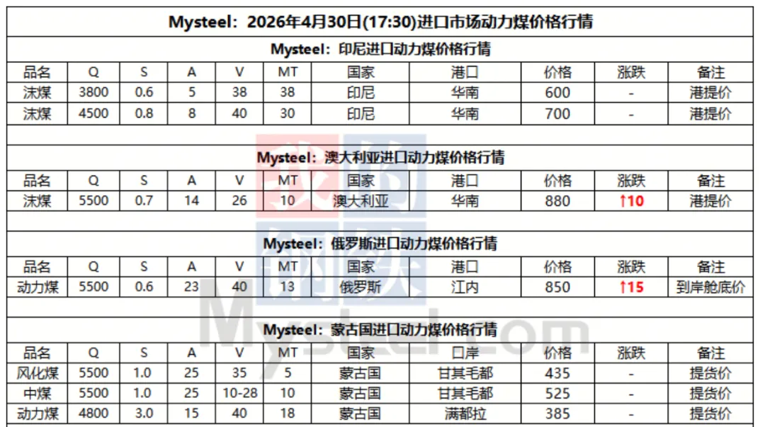 30日进口市场动力煤价格稳中偏强运行。外盘市场上,印尼动力煤供应持续收紧,国际采购需求保持稳健,支撑煤价继续高位运行。现印尼Q3800巴拿马船型FOB报价围绕63-65美元/吨徘徊,周环比上涨1-2美金/吨不等。高卡澳煤方面,东南亚需求不减,个别中国买家追高采购也使得矿方报价坚挺,现Q5500澳煤大船FOB报价围绕95美元/吨震荡。国内市场上,华南地区强降雨天气制约新能源出力,叠加天然气进口受限,火电负荷有所提升,电厂进口煤招标需求同比增加,沿海电厂陆续释放5-6月远期进口货盘需求,据悉华南区域电厂Q3800投标区间在575-580元/吨,投标重心继续上移。预计短期内进口煤价将延续偏强态势,后续重点关注内贸煤价变动情况。