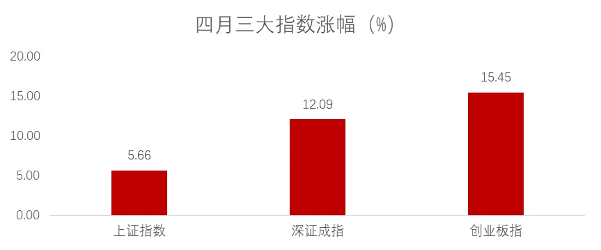 今天是四月最后一个交易日,尽管深成指和创业板指小幅收跌,但这丝毫不影响四月的整体行情。全月来看,上证指数上涨5.66%,深成指大涨12.09%,创业板指涨大15.45%。深成指和创业板双双创新高,其中创业板指还是11年的新高。