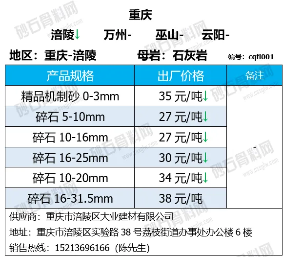 小贴士:砂石骨料网数据中心为您整理部分地区近半月的价格变化趋势。在每个地区的开头,城市后方添加标识以区分价格涨跌,分别为:“↑”价格上涨。“↓”价格下跌。“-”价格无明显变化。