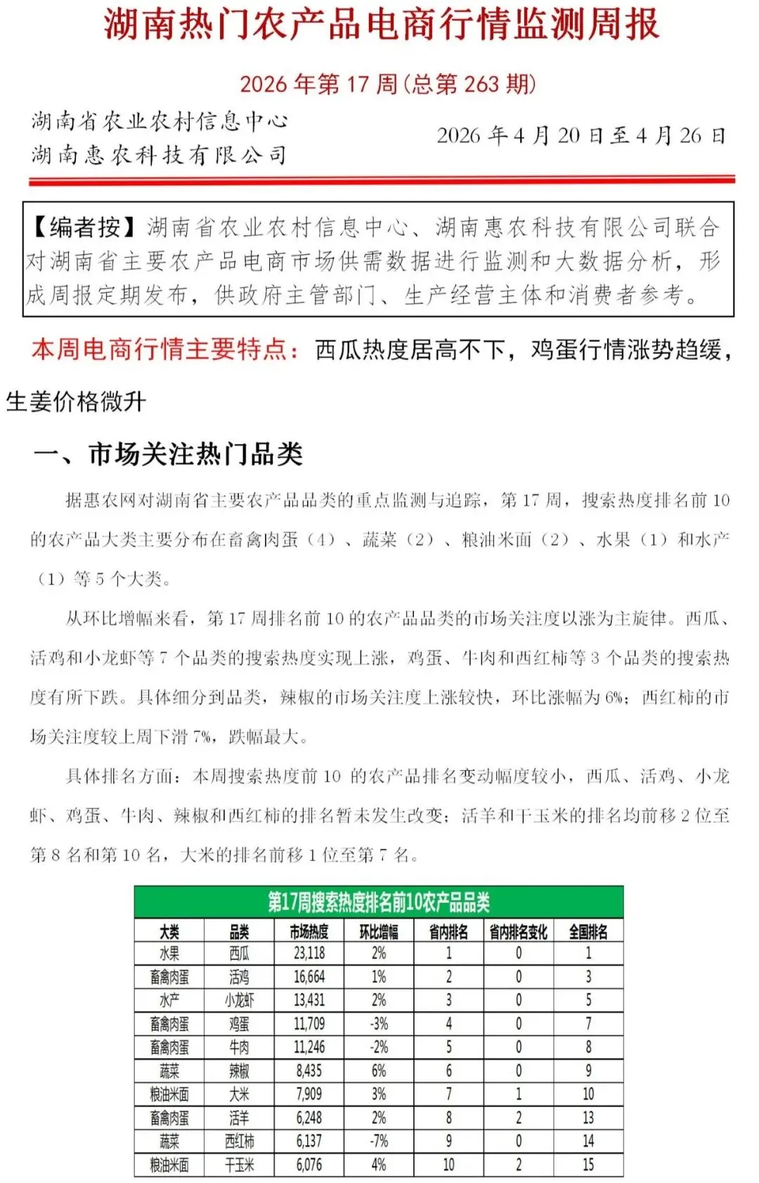 >湖南热门农产品电商行情监测周报(2026年第17期)