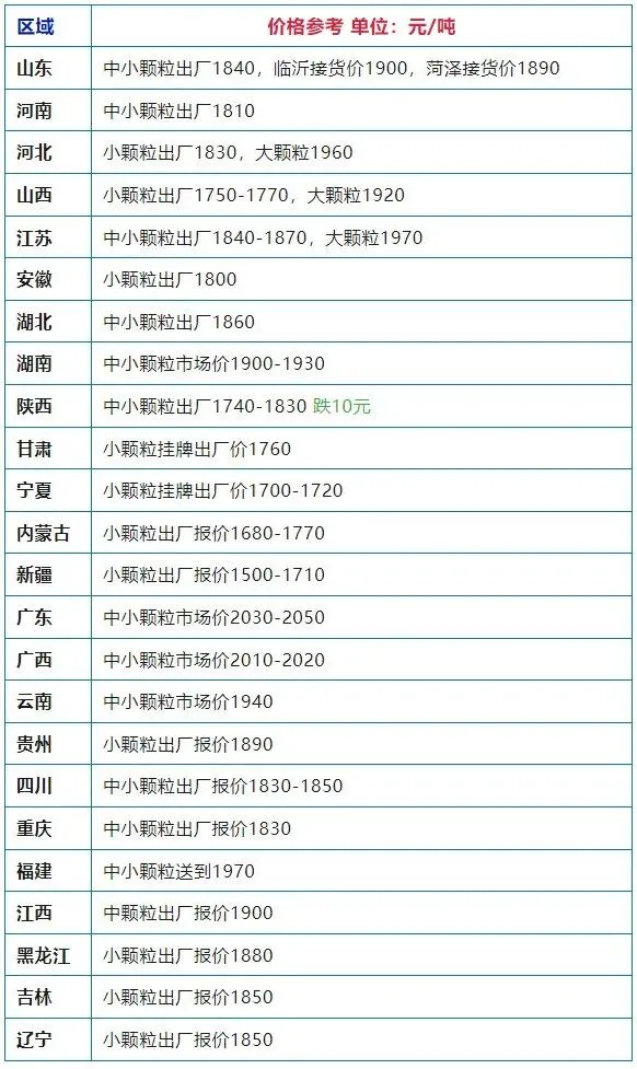 湖北64%颗粒:4100-4150、河北57%颗粒:4200-4250、山东57%颗粒:4200-4250、安徽57%颗粒:4150-4200、陕西60%颗粒:4300-4350、甘肃64%颗粒:4250-4350、江苏64%颗粒:4600-4650、黑龙江64%颗粒:4580-4600