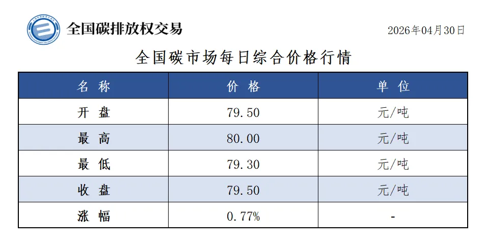 当前位置:首页>行情>【碳市行情】2026年4月30日全国碳市场成交数据