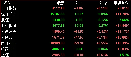 A股三大指数今日涨跌不一,截至收盘,上证指数4112.16涨0.11%,深证成指15107.55跌0.09%,创业板指3677.15跌0.27%,北证50指1330.09跌0.12%,科创50指数1950.43.涨5.19%。全市场成交额27592亿元,较上日成交额放量1503亿元,全市场超2800只个股上涨。