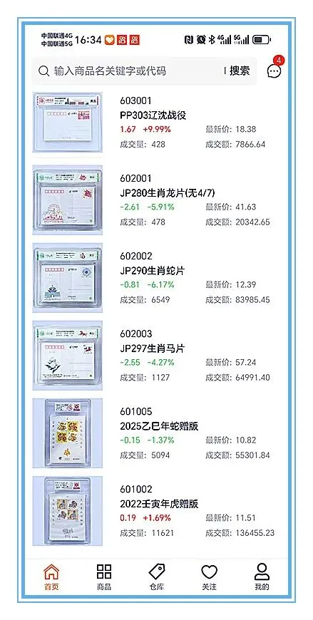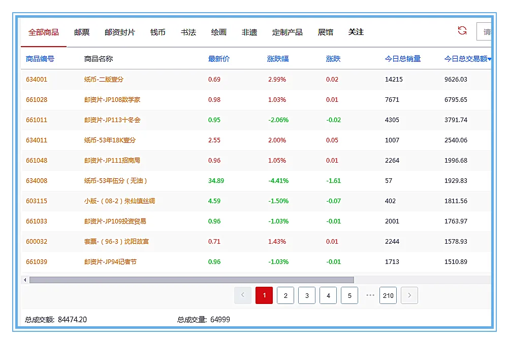 大盘成交8.45万元,邮票板块成交2.61万元,占30.87%;封片板块成交4.2万元,占49.72%;钱币板块成交1.64万元,占19.41%。盘中1236个品种,上涨195个,下跌品种181个,无交易品种832个。