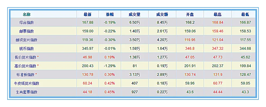 今天三大指数全线下跌,综合指数167.88跌-0.19%;邮票板块指数159.00跌-0.22%,封片板块指数119.36跌-0.30%,钱币板块指数345.97跌-0.01%,封片指数跌幅大。