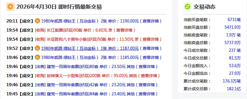 文娱寄卖:4月30日,今天盘面相当低迷,大盘盘中跌多涨少,成交严重缩量,全天没有一个成交上万元品种,成交较好的只有二版壹分、数学家、十冬会等,大家信心一落千丈。