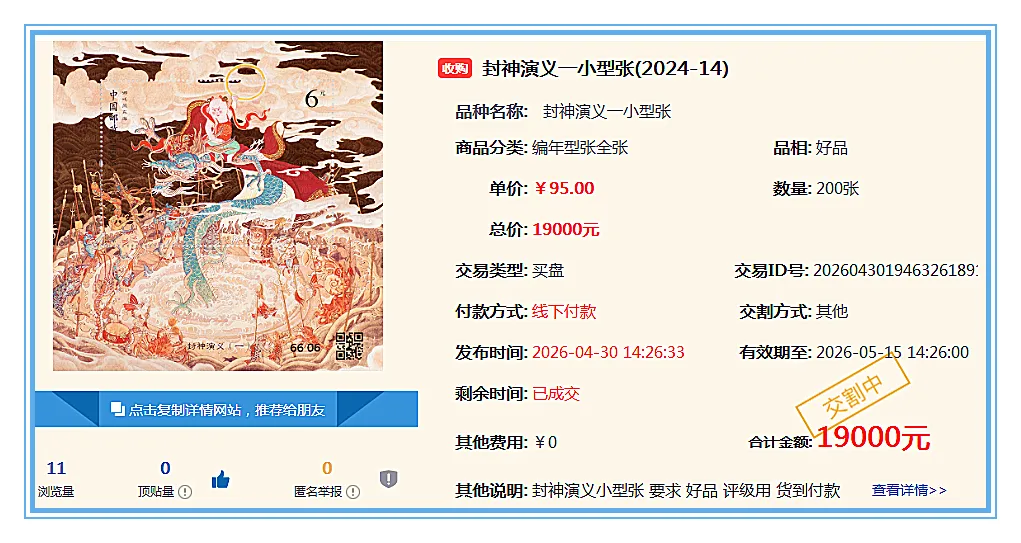 封神演义一小型张200张95元,莫干山小版200版12.80元,长城版票500版6.45元,长江版票410版6.60元,建党一百周年套票726套23.50元,解放军挂像英模小版345版7.50元,三轮蛇大版65版19元,台湾光复纪念日纪念封(PFTN-133)60套50元,治淮六十周年套票200套2.30元,四轮猴套票108套1.65元,三轮兔套票800套0.95元,中国篆刻三套票1125套4.85元,出圉图护邮卡50套20.60元。