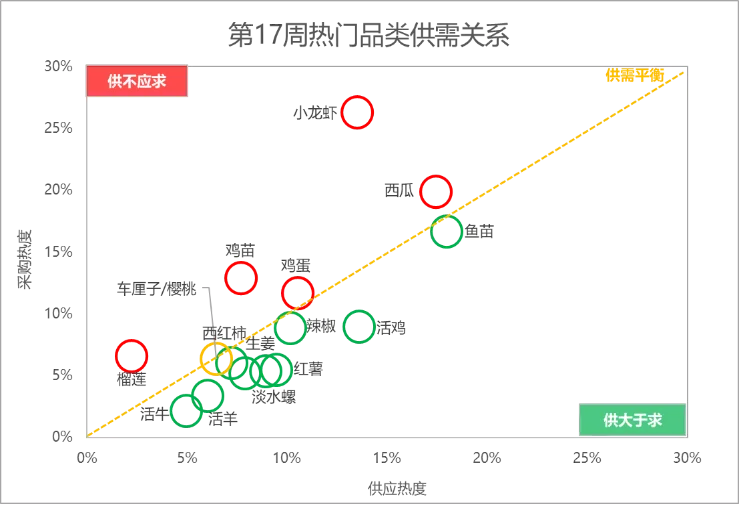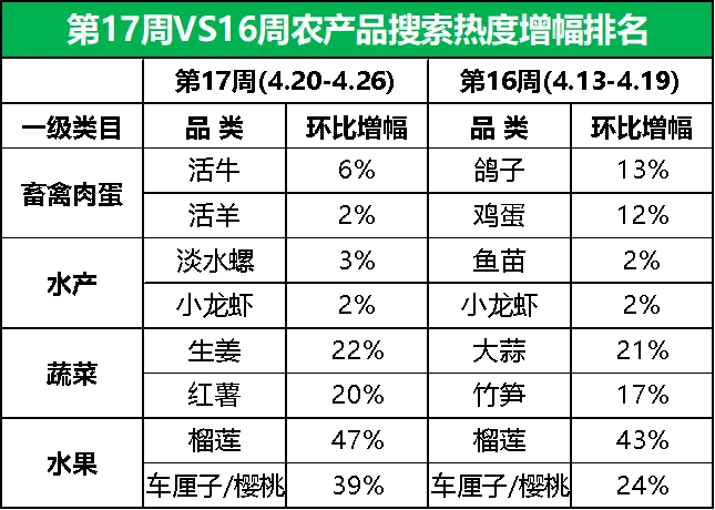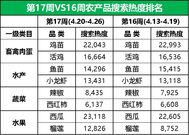 榴莲占市场“C位”,生姜和西瓜价格微升,樱桃行情大“跳水”第17周,惠农网平台搜索热度排名前15的农产品主要分布在畜禽肉蛋(5)、水果(4)、水产(2)、蔬菜(2)和粮油米面(2)等5个大类,相较于上一周,畜禽肉蛋和粮油米面下的品类数量均增加1个,水果和蔬菜下的品类数量均减少1个。从环比增幅来看,第17周排名前15的农产品品类的市场关注度以涨居多。西瓜、活鸡、小龙虾、榴莲和辣椒等9个品类的搜索热度实现增长,鸡苗、鱼苗、鸡蛋、牛肉和甜瓜等6个品类的搜索热度有所下滑。具体细分到品类,榴莲涨势依旧,市场关注度较上周再涨47%,居首位;市场关注度下滑较为明显的品类是鱼苗和西红柿,环比跌幅均为7%。从排名来看,车厘子/樱桃、干玉米和活羊的排名分别前移11位、4位和3位至第12名、第15名和第13名,榴莲和大米的排名均前移2位至第6名和第10名,西瓜和辣椒的排名均前移1位至第1名和第9名;甜瓜的排名后移2位至第11名,鸡苗、鸡蛋、牛肉和西红柿的排名均后移1位至第2名、第7名、第8名和第14名;活鸡、鱼苗和小龙虾的排名暂未发生改变。据惠农网平台对畜禽肉蛋、水产、蔬菜和水果4大农产品类目的重点监测与追踪,第17周,畜禽肉蛋、水产、蔬菜和水果排名前2位的品类与上周保持一致,但热度均有所调整:畜禽肉蛋方面,鸡苗热度轻微下滑,活鸡热度飘红;水产方面,鱼苗热度出现下跌,小龙虾热度接连上涨;蔬菜方面,辣椒热度“升温”,西红柿热度走低;水果排名前2位的品类热度则全线上涨。2.2 市场潜力搜索品类
