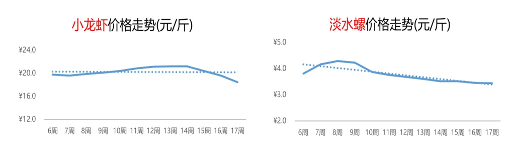 当前,活鸡的供需均无明显变化,价格以稳为主。第17周,活鸡的价格为9.1元/斤,环比基本持平,同比上涨2%五一节前备货需求依然存在,但已进入尾声;在产蛋鸡存栏偏高,市场货源整体充足,受此影响,蛋价上涨动力减弱。本周,鸡蛋的周均价环比上涨2%至5.7元/斤,同比下跌6%。4.2水产:小龙虾价格连降3周,淡水螺行情开始企稳