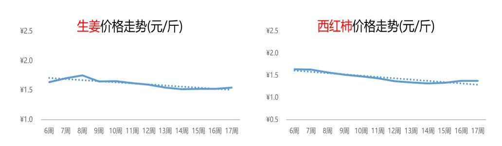 暖冬气候有利于虾苗的存活和生长,小龙虾的生长周期缩短,上市时间比往年提前;加之湖北和湖南等主产区的小龙虾同时进入上市期,多重因素导致市场供给增加、价格回落。第17周,小龙虾的价格为18.4元/斤,环比和同比纷纷下滑,跌幅分别为6%和11%。经历了2个月的连续下跌后,淡水螺的行情在本周止住跌势,开始出现企稳信号,周均价为3.4元/斤,较上周价格基本持平,较去年同期上涨7%。4.3 蔬菜:生姜行情弱势反弹,西红柿价格较为稳定