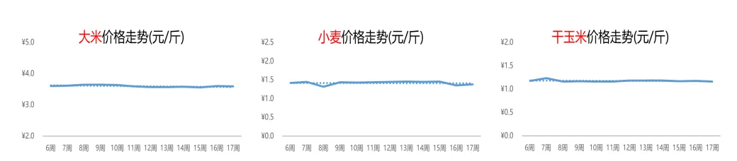 当前正处“老姜库存渐少、新姜尚未上市”阶段,整体供应尚有压力,价格轻微上调。第17周,生姜的价格为1.5元/斤,环比涨幅为2%,但同比跌幅达25%。本周,西红柿价格结束了此前连续2周小涨的势头,进入平稳期,周均价为1.4元/斤,环比基本持平;而从同比看,今年价格水平相对偏高,上涨11%。近期,随着气温升高,西瓜的市场需求有所增长,热度不断攀升,带动行情微幅上涨。本周,西瓜的价格为每斤1.0元,环比涨幅为1%,同比跌幅为12%。一方面,国产樱桃上市量逐步增多;另一方面,樱桃极难保鲜,仓储压力较大,两者叠加促使价格回落速度加快。第17周,樱桃的价格进一步降至23.0元/斤,环比和同比分别下跌25%和33%。4.5 粮食:大米和干玉米价格平稳,小麦行情上扬
