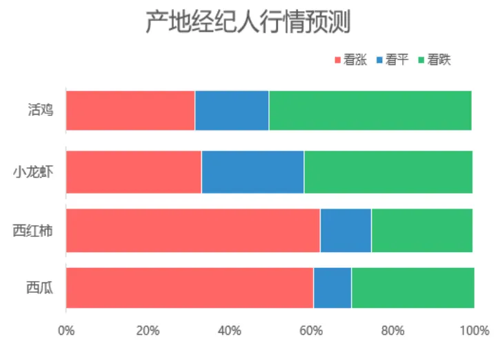 据产地经纪人对热门品类后市行情预测:活鸡后市价格或将偏跌,看跌的比重为50%;小龙虾看涨、看稳和看跌各占一定的比重,但看跌的比重要稍多一些;西红柿和西瓜方面,其后市行情大概率上涨,看涨的比重均超过6成。湖南惠农科技有限公司