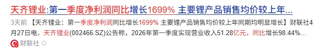 盐加工领域增速龙头,现有锂盐产能规模位居行业前列,产线可灵活切换碳酸锂与氢氧化锂,适配下游不同客户需求,一季度业绩增速突破1400%,量价齐升逻辑清晰,后续产能持续释放将进一步提升增长动力。
