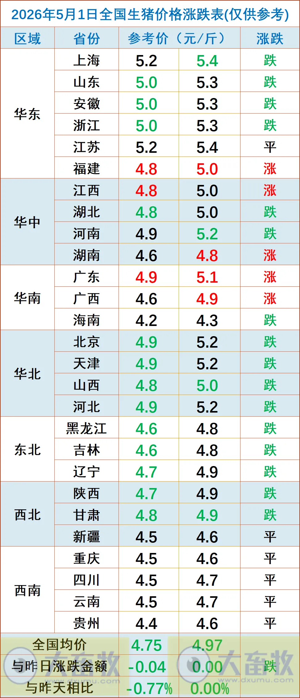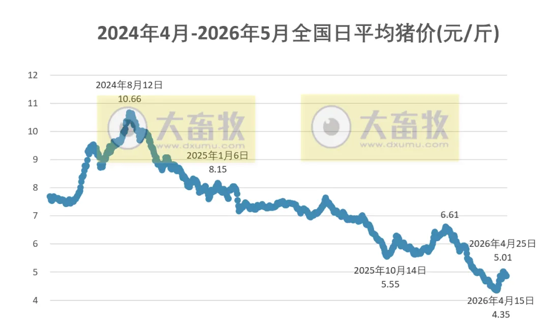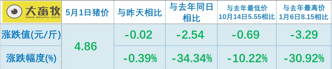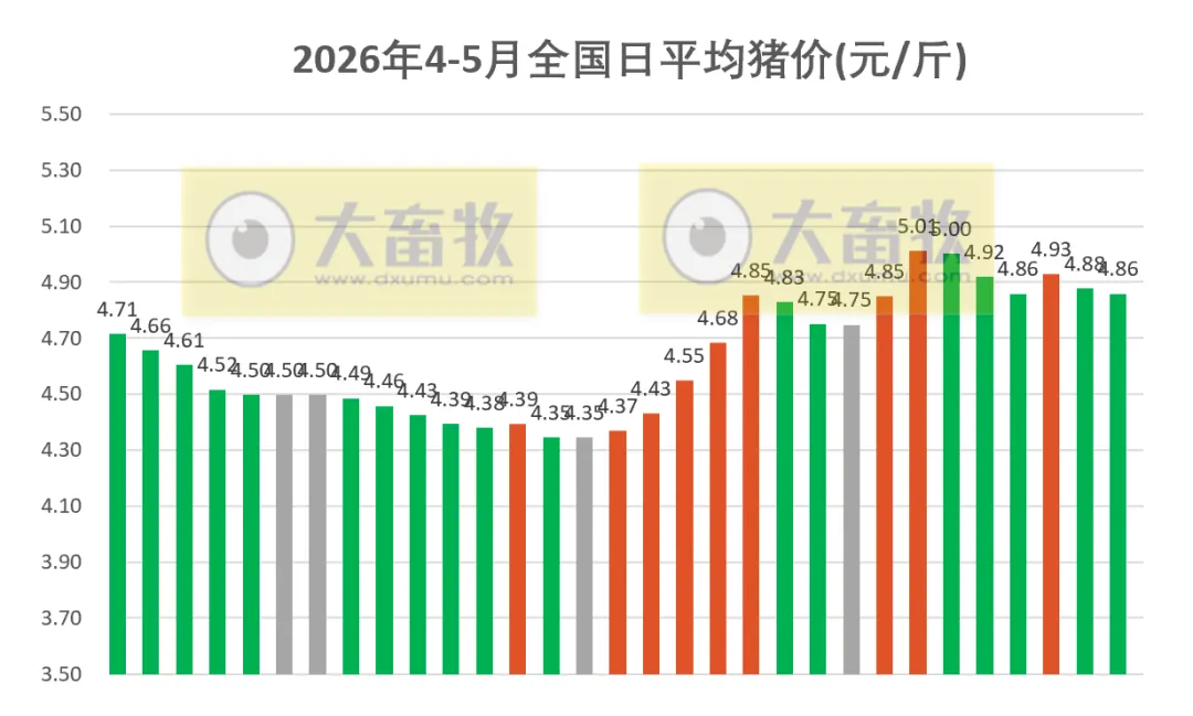大畜牧小编根据我国27省的猪价数据,计算出2026年5月1日全国平均猪价为每斤4.86元,比昨天下跌0.02元,跌幅为0.39%,跌幅收窄,连续两天下跌,累计下跌0.07元;