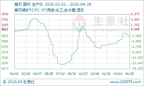 4月份国内萤石价格走势下滑,截止月末国内萤石均价为3518.75元/吨,较月初价格3568.75元/吨下滑1.40%,同比下滑5.22%。