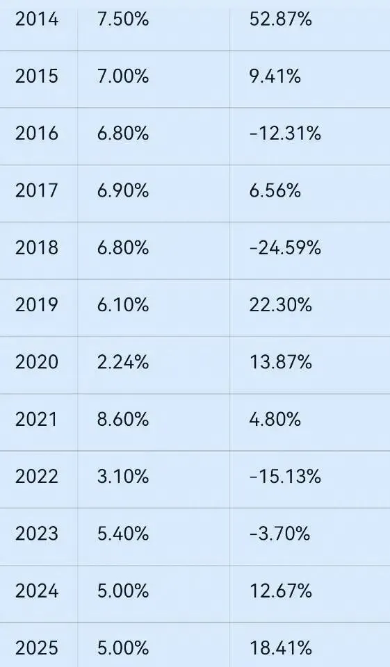 左侧是最近几年的经济增长率,右侧是相对应的历年上证指数涨跌幅。仔细对比一下,两者之间有任何关系吗?压根没有。