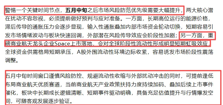 同时,商业航天板块延续此前的强势节奏,在科技主线的带动下持续走强,充分印证了我们此前对其“高确定性机会”的判断;周期资源类标的同步出现轮动走强,与半导体、航天形成多主线共振,展现出资金布局五月行情的前瞻性。两市成交额保持高位放量状态,资金交投活跃,筹码快速换手,上涨家数显著多于下跌家数,市场整体情绪中性偏强,节前资金并未出现大规模避险出逃,反而积极布局节后行情,为五月市场奠定了良好的资金基础。