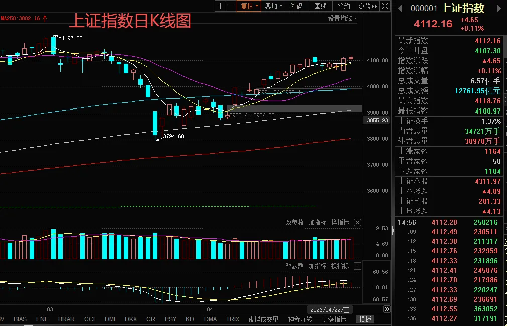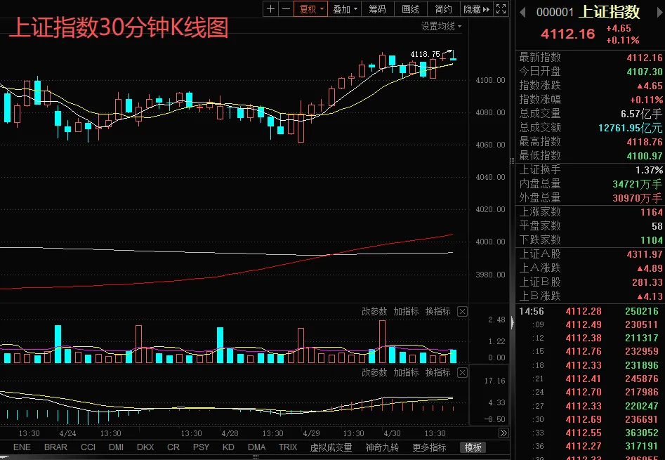 今日上证指数日K线收小实体阳线,成交量放大,跟昨天的长阳K线对比,说明上涨势头减缓,在30分钟K线图中,很符合预期的超过了之前的4114点,创出了新高,之后短期均线纠缠,同时日K和30分K里的MACD