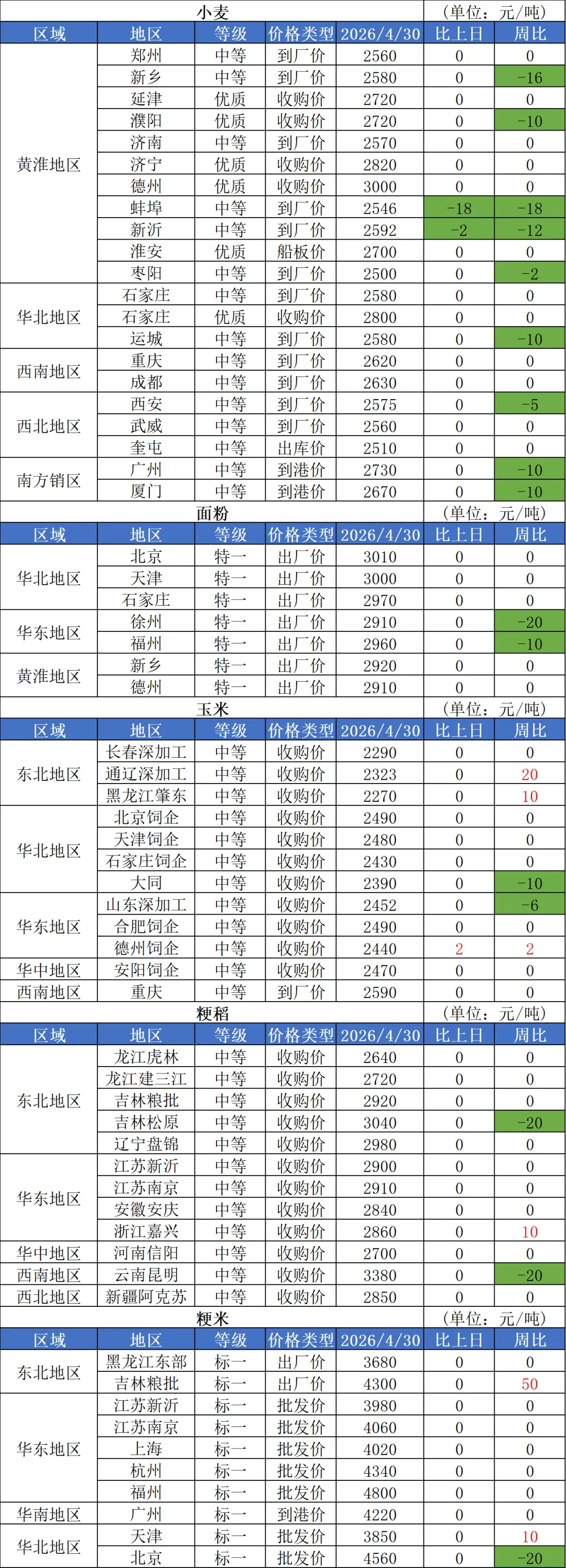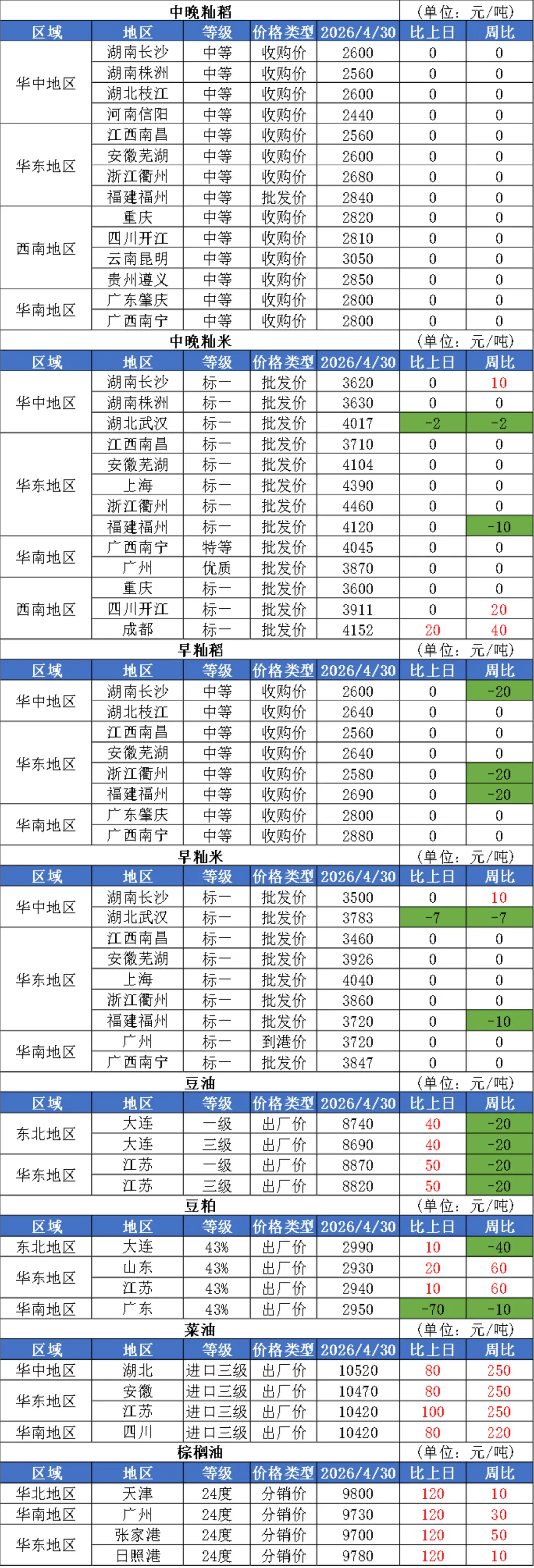 1、4月30日,小麦市场整体维持稳中偏弱运行,市场供需博弈激烈,暂时没有明显利好因素支撑,部分厂家小幅下调收购价格。在下游需求没有明显改善、新麦产情未遭遇明显不利因素的情况下,小麦价格大概率维持弱势震荡。2、近日,农业农村部成立生猪产业监测预警专家咨询委员会,凝聚行业共识、强化预警引导,探索有效发挥政府调控作用的重要举措,会议要求,要充分发挥委员会作用,完善生产与市场监测调查体系,提高监测数据质量,促进生猪产业稳定健康发展。3、上周湖北省内稻价下行,观望气氛渐浓。湖北全省中晚籼稻收购均价2585元/吨,周比下跌8元/吨;早籼稻收购均价2600元/吨,周环比下跌5元/吨。荆州地区丰两优价格1.30-1.31元/斤,周比每斤下跌1分钱左右;随州、黄冈等地丰两优稻谷米厂原粮到货价围绕1.29元/斤小幅震荡,周环比下降0.005-0.01元/斤。4、分析机构油世界称,2025/26年度全球大豆压榨预测值上调200万吨,达到创纪录的1.0026亿吨,比上年的前峰值9646万吨增加3.9%,主要由于全球豆油和豆粕需求强劲增长。5、本周进口菜籽压榨节奏偏慢,市场担忧俄罗斯菜油进口减少,叠加国际原油及ICE菜籽价格上涨,本周菜油期价持续走高,不过市场预期节后进口加菜籽将集中入榨,菜油基差承压下调,现货价格整体跟盘上涨。