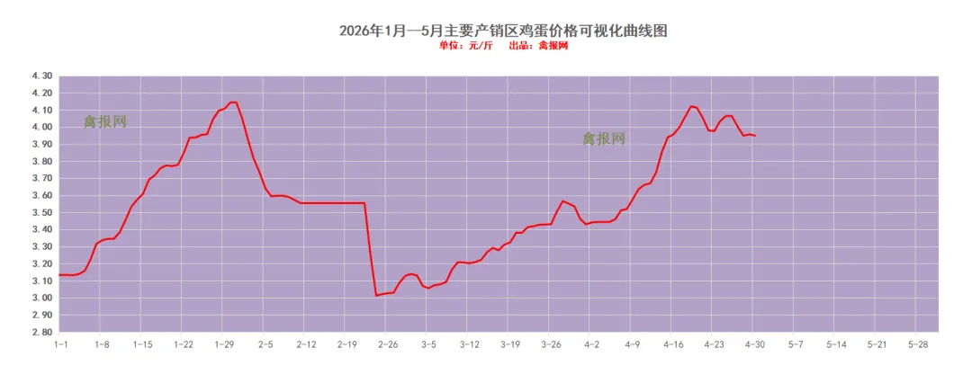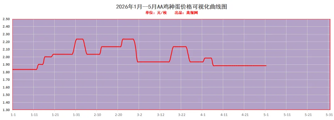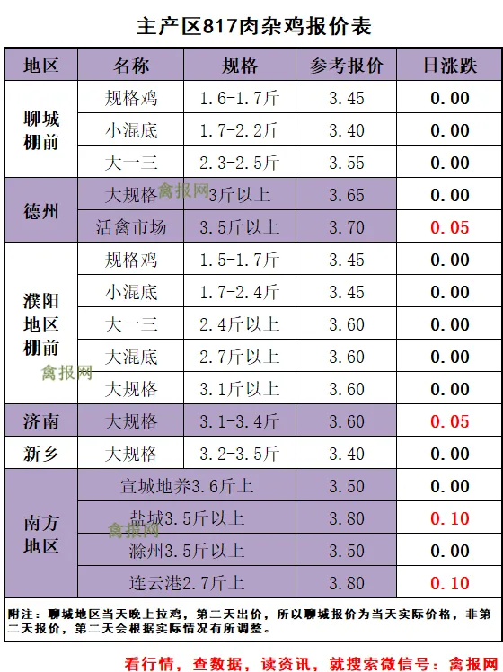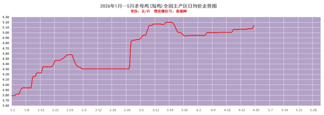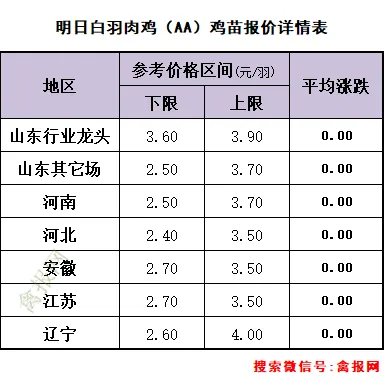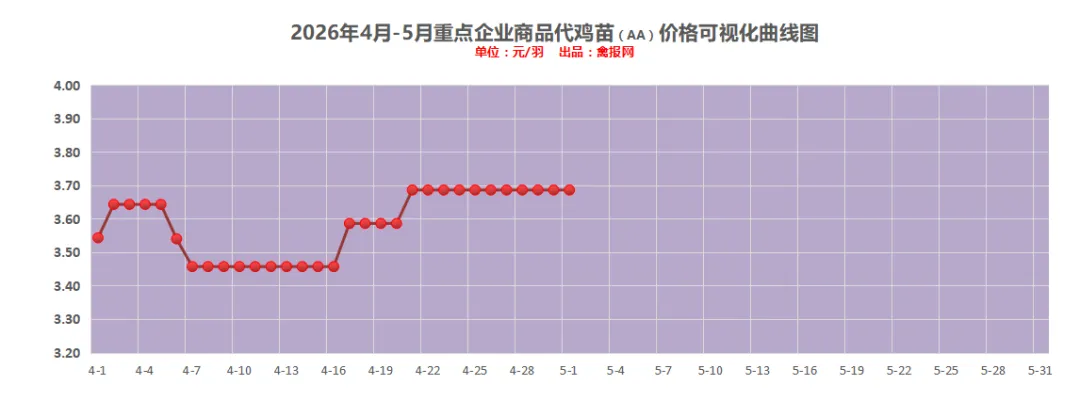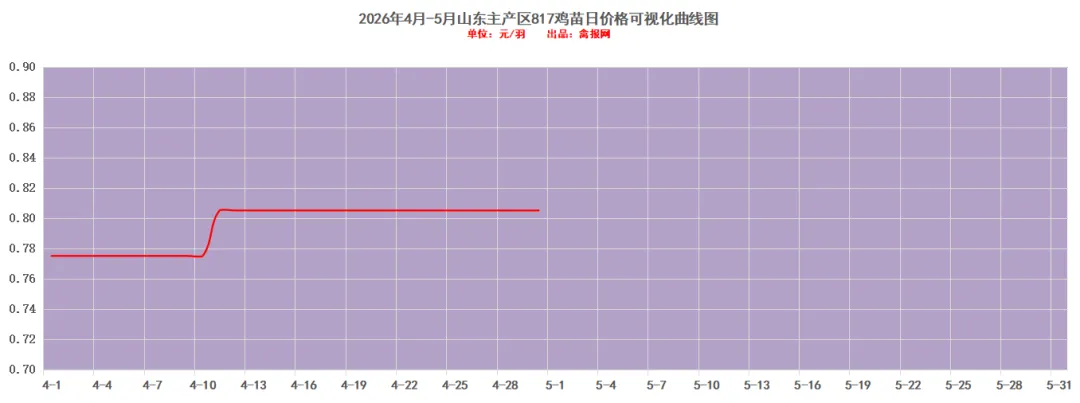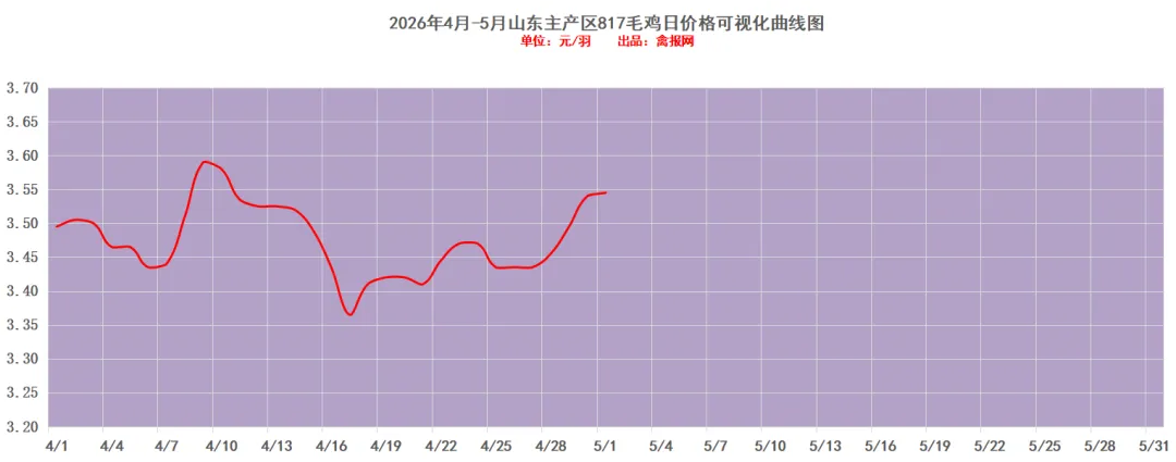 附注:2022-2023年每日毛鸡价格走势图(需求各种产业数据可后台留言)从监测样本商品苗销售数据看,2026年第15周(2026/4/13-2026/4/19)鸡苗销量数值区间在9058万羽左右(上周在9620万羽左右),较前一周环比下降了5.84%,理论上对应出栏时间在2026/5/24-2026/5/30日期间。(实际养殖过程中仍要考虑成活率等因素,以上数据只是理论销售数据)。(附注:4/27日更新)龙头孵化大场——山东报价上涨了0.00元/羽,辽宁报价上涨了0.00元/羽,具体价格为:山东报价3.90元/羽;辽宁报4.00元/羽;山东、河南、河北、江苏、安徽以及辽宁等主产区重点孵化场综合均价3.69元/羽,较上一日报价上涨了0.00。毛鸡报价保持稳定,今天苗厂计划总体基本顺利,局部有掉计划议价情况,挺价情绪强,与此同时小场出苗很少,苗价差异缩小。当前局地养户补栏观望,一是担心季节交替不好养,二是想控一下苗价成本。主产区今日综合均价1.88元/枚,较上一日报价保持稳定。具体情况:行业龙头厂家报价区间一般在1.90-2.40元/枚;分区域中小场报价:辽宁区域参考价格1.60-1.70元/枚、河南山东区域参考价格1.80-1.90元/枚。明天(5/1日)北方地区(聊城、德州、济南、新乡四个主产区)817毛鸡综合日均报价上涨了0.01,综合均值为3.55元/斤。今天(30日)主产区出箱综合均价保持稳定,主产区结算参考均价0.81元/羽左右。主流报价区间0.50-0.55元/枚,较上一日报价保持稳定。2、【今日价格行情综述】