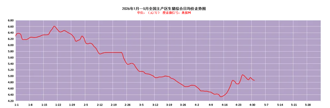 明天(5月1日)全国重点地区生猪综合均价为4.86元/斤,综合日均报价相较上一日报价下跌0.03。
