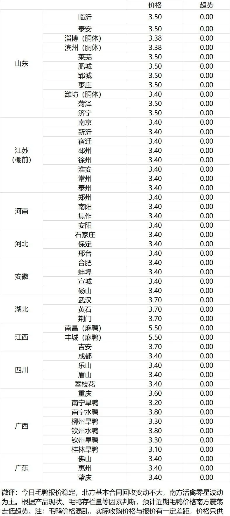 微评:鸭苗报价稳定。(注:南方只报当天价格)大厂控量保价,排苗计划偏紧,窄幅波动为主。根据产品、养殖成本及鸭苗现状分析,预计近期鸭苗价格呈震荡微调趋势。种蛋报价稳定。温馨提示:该价格为主流厂家报价,实际销售价格以成交价格为准,价格仅供参考。