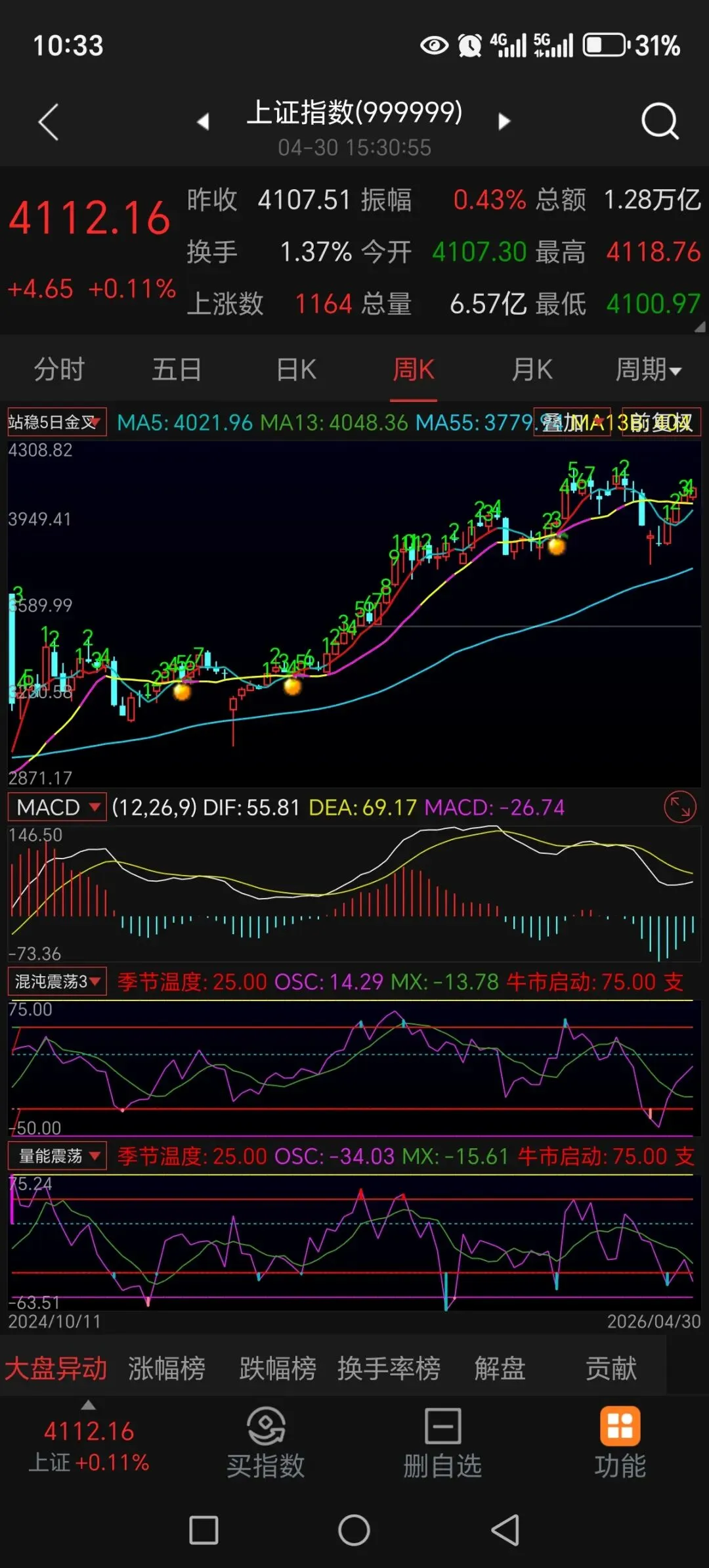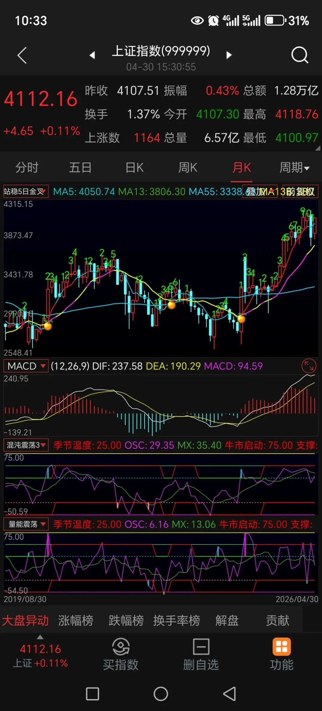 月线作为判断中长期趋势的核心指标,能够有效过滤短期市场波动干扰,更精准地反映市场整体运行方向。当前月线级别指数处于上升通道,各项中长期技术指标持续向好,量能同步温和放大,说明资金中长期布局A股的意愿十分坚定,市场具备持续走强的底层逻辑。经过4月份的稳步上涨,指数进一步打开了中期上行空间,5月份市场将延续这一强势格局,即便盘中出现震荡整理,也只是对前期涨幅的技术性修复,不会扭转月线级别的上升趋势,中长期投资者可继续保持乐观持仓态度。