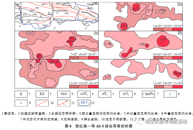 (1)前红泉金矿是在 1∶50 000 矿调工作的基础上通过大比例尺化探手段逐步发现的。该矿床的发现证实 1∶50 000 水系沉积物测量是该区最有效的找矿手段,Au高值异常可直接指示矿体的赋存部位,低弱异常也具有较好的找矿潜力,后续勘查工作中不但要重视“高、大、全”异常,更不能忽视对“低、弱、缓”异常的查证力度。1∶10000 岩屑测量在矿床发现过程中起到了重要作用,不仅使 1∶50 000 化探异常得到重现和浓缩,还能在地表快速锁定找矿靶区,直接指示矿化富集地段。因此,1∶50000化探异常在查证过程中不仅仅要依靠综合剖面测量等手段,大比例尺化探扫面工作能够加快找矿进程。