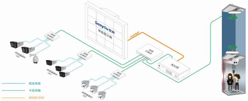 如上图,在电梯井内安装世友电梯监控专用CPE无线套装,取代传统有线线缆,省去大量布线工作。方案采用NVR(硬盘录像机)集中管理所有监控摄像机。