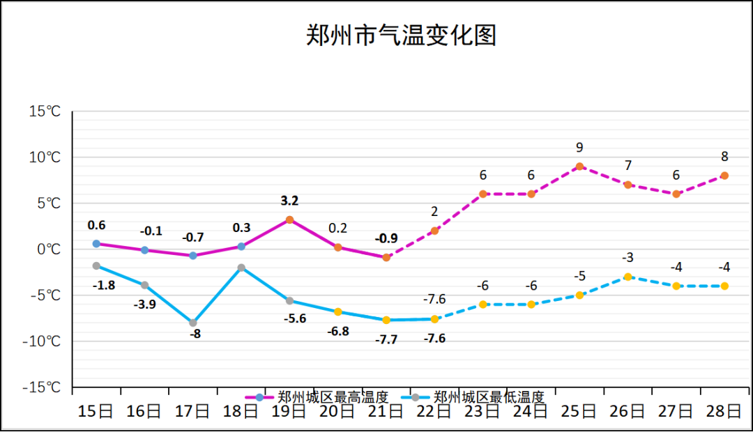 其中郑州气象站最低气温零下7.6℃,全市最低气温极值出现在中牟的千禾农场,零下15.2℃。