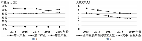 云南红河州的个旧市被誉为“锡都”,是一座以有色金属矿业及其延伸产业为主导的资源型工业城市,日前已处在产业转型时期。下面图1、图2分别为个旧市三大产业结构比例及企事业机关在岗职工人数变化示意图。读图,完成下面小题。