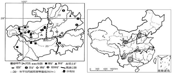 贵州省是我国能源资源相对丰富的地区,煤炭资源储量排在全国前列,且埋藏浅,煤质好。贵州省水能资源丰富,是仅次于煤炭资源的第二大供能资源。国家实施西部大开发战略后,贵州省充分发挥有水有煤、水火互济的能源优势,成为“西电东送”的主要省份。下面左图为贵州省主要自然资源及铁路线分布图,右图为我国西电东输示意图。