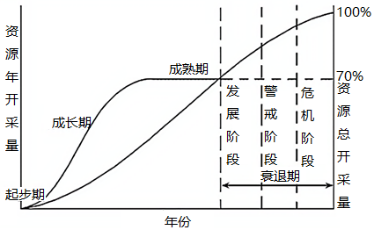 ①当资源总开采量达到70%时,资源型城市进入衰退期