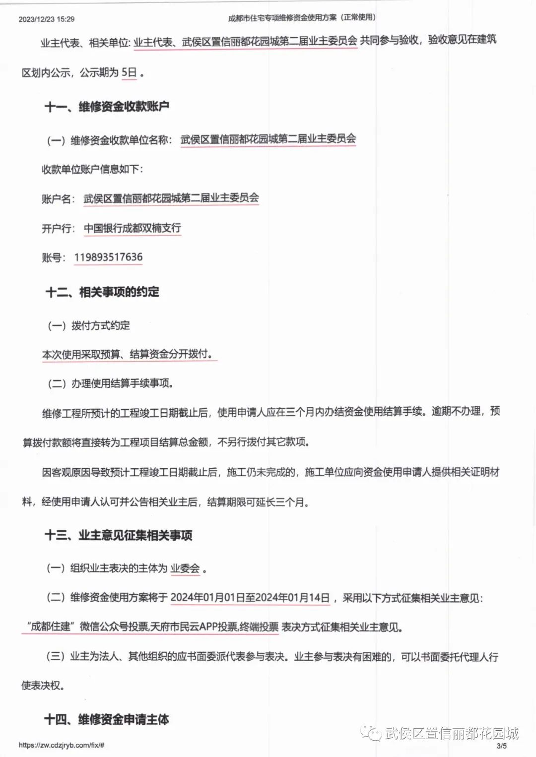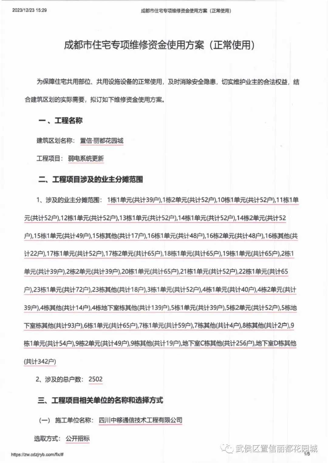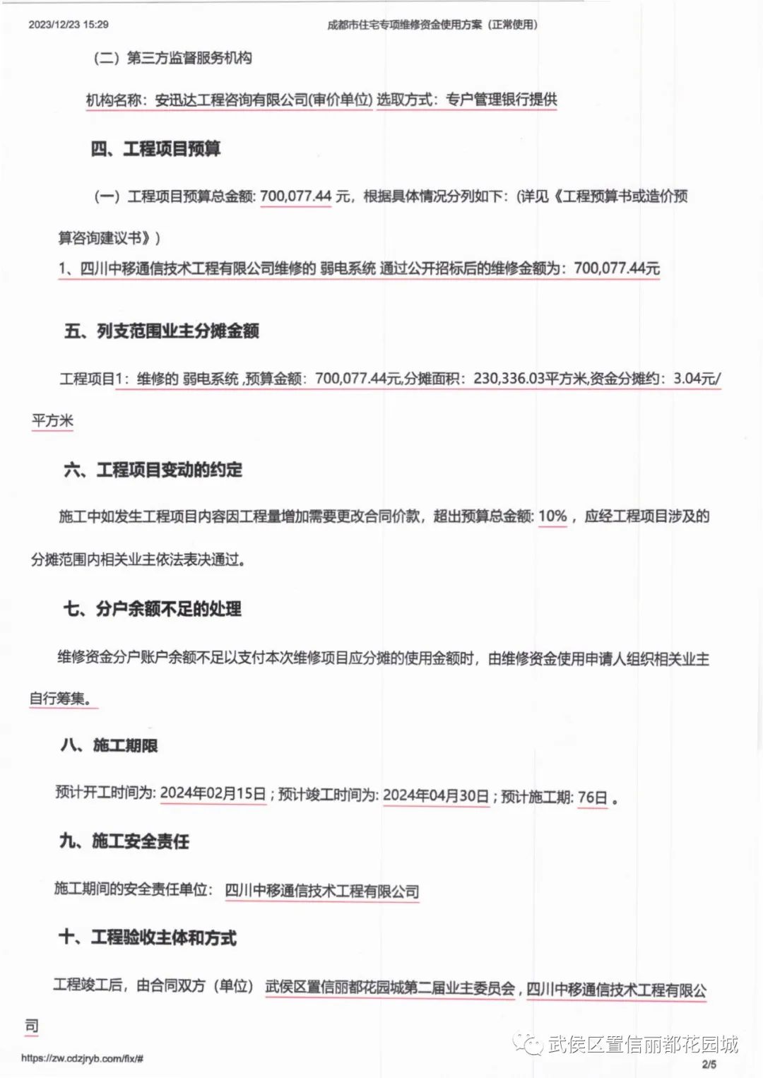 依照《成都市住宅专项维修资金使用服务指南(2022版)》规定,现向全体业主公示小区安防改造项目维修资金使用方案、工程预算书、控制价及工程量、控制价审查建议书、招标文件、投标文件、中标书等相关材料,公示期5天。