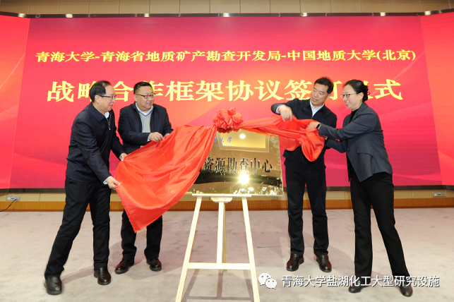 在签约及揭牌仪式上,张启元局长、武雄副校长和任延明常务副校长签订了三方战略合作框架协议,参会领导共同为青海大学盐湖资源勘查中心揭牌并合影留念。
