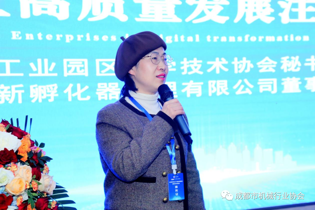 为了让更多企业了解数字化服务工作,鼓励更多企业开展数字化建设。成都市机械行业协会创咨委主任、新津园区科协秘书长李惠琴、以《助力企业数字化提档转型升级为企业高质量发展注入新动能》为主题,围绕汇聚数字化服务资源、服务企业战略发展、推动企业打通数字孤岛、未来工作计划等四个方面作了介绍汇报,她介绍了协会、园区近两年从深入企业开展数字化需求调研走访,到寻找相关资源促进合作,再到开展数字化专题活动搭建交流平台,最后到成果展示的全链条闭环服务模式。此外,她对区经信局、区科协以及行业协会给予的指导和支持表示衷心感谢。