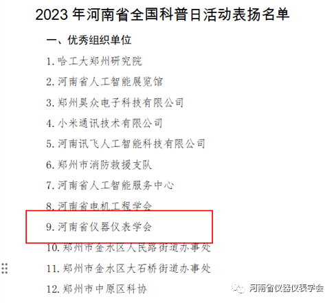 据河南省科协关于表扬2023年河南省全国科普日优秀组织单位、优秀特色活动和优秀工作者的通知获悉,按照《关于举办2023年河南省全国科普日活动的通知》(豫科协发〔2023〕50号),省科协对哈工大郑州研究院等178个优秀组织单位、“河南省气象科普体验活动暨第二届‘风云杯’气象纸模科普拼装大赛”等187项优秀特色活动和侯晓宇等197名优秀工作者进行表扬。希望受到表扬的单位和个人再接再厉,奋发进取,持续推动科普活动常态化、社会化、品牌化发展,为促进我省公民科学素质跨越提升作出新贡献。河南省仪器表学会积极组织科普专家参加全国科普日,荣获2023年河南省全国科普日优秀组织单位。