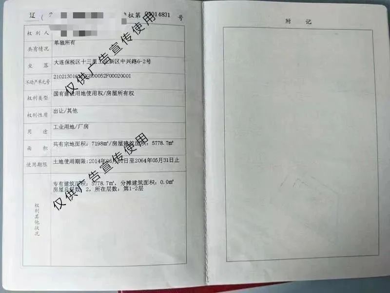 转让项目位于大连保税区十三里工业新区。转让项目土地占地面积为7198平方米,土地使用期限:2014年6月1日至2064年5月31日止,土地用途为工业用地,房屋总建筑面积为8508平方米。转让项目包括三层办公楼,总建筑面积为1325.8平方米。转让项目包括两层厂房,其中,第一层层高7米,第二层层高6米,总建筑面积为5778.7平方米。转让项目包括三层综合服务楼,内设员工食堂,宿舍,小型厂房,总建筑面积1403.58平方米。
