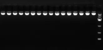 图2:提取同一批16个质粒,单样本量:4 mL,胶为:1.5%,上样体积:2uL,90V,时间:20min