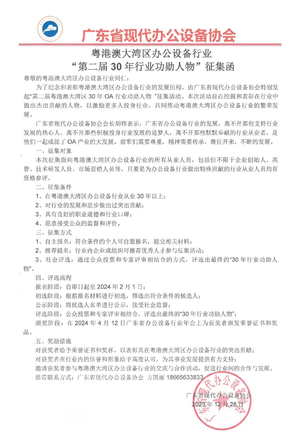 为了纪念和表彰粤港澳大湾区办公设备行业的发展历程,由广东省现代办公设备协会特别发起“第二届粤港澳大湾区办公设备行业30年功勋人物” ”征集活动。本次活动旨在挖掘和表彰在行业中做出杰出贡献的人物,以激励更多人投身行业,共同推动粤港澳大湾区办公设备行业的繁荣发展。