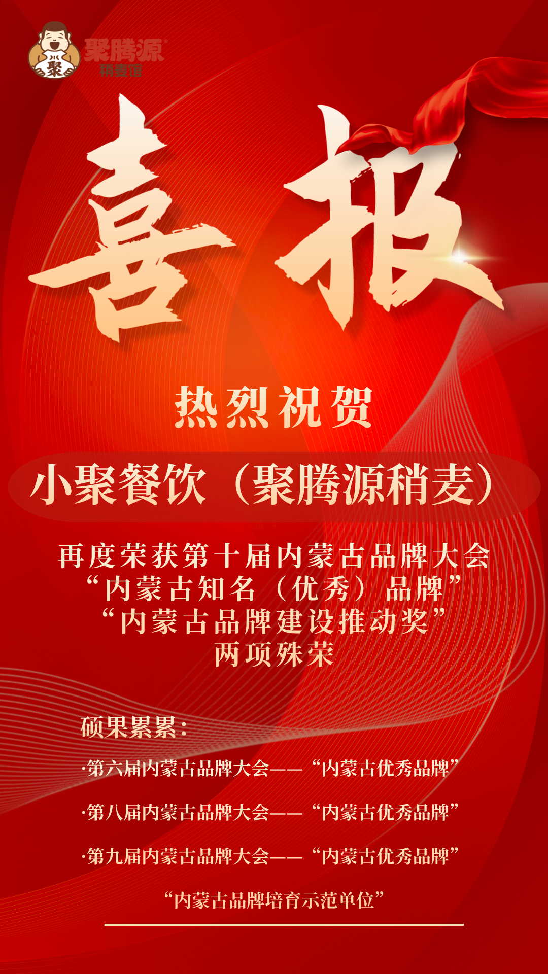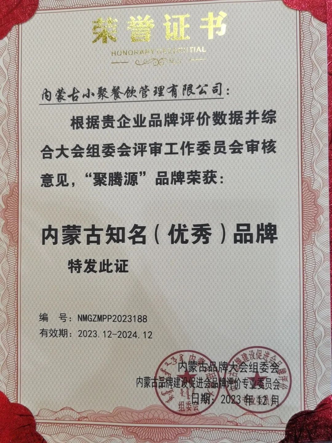 大会向获得内蒙古知名(百强、优秀、区域公用)品牌企业代表颁发了牌匾证书。内蒙古小聚餐饮管理有限公司(聚腾源稍麦)被再次授予“内蒙古知名(优秀)品牌”奖牌和荣誉证书;内蒙古小聚餐饮管理有限公司(聚腾源稍麦)董事长张静波被授予2023年度内蒙古品牌人物“内蒙古品牌建设推动奖”。